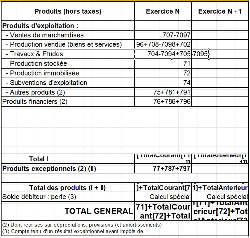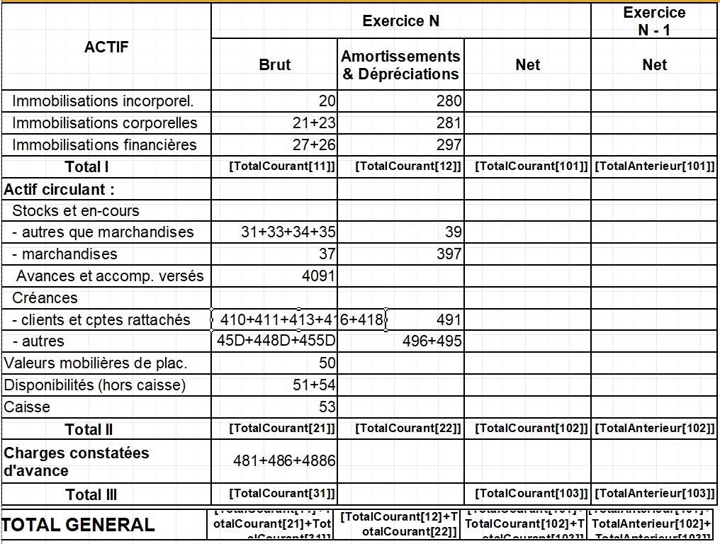Pour information, vous trouverez ci-dessous les formules de calcul, le chiffre indiqué dans la case étant la racine du compte, la lettre “D” signifie que l'on prend le solde débiteur, la lettre “C” le solde créditeur, l'absence de lettre signifie que l'on prend le solde comptable du compte (crédit-débit si le compte est de nature créditeur, sinon l'inverse)