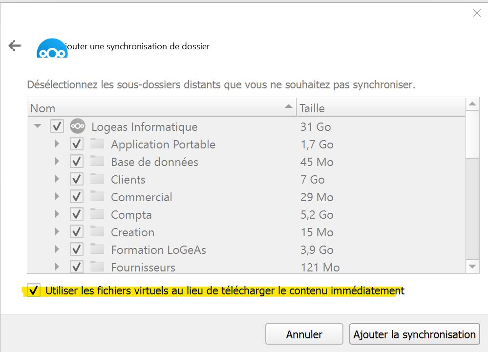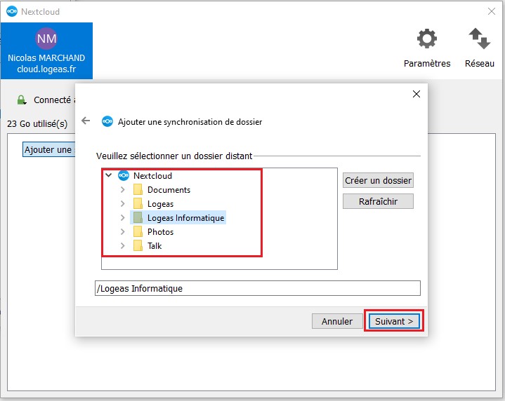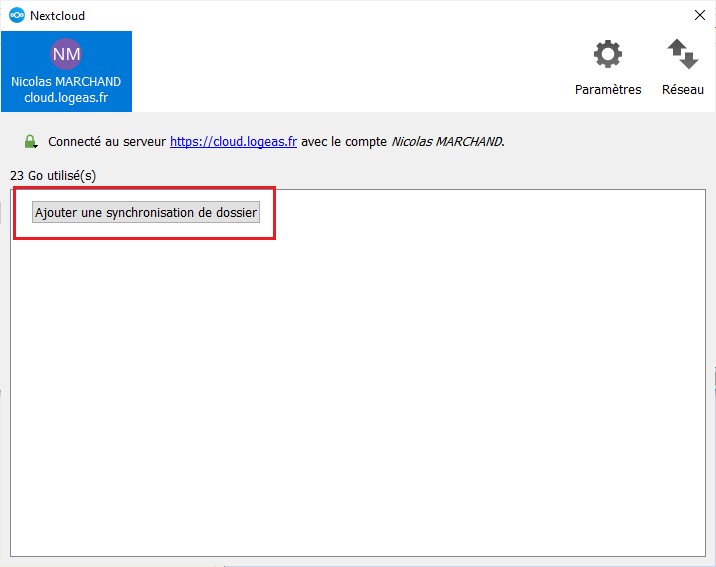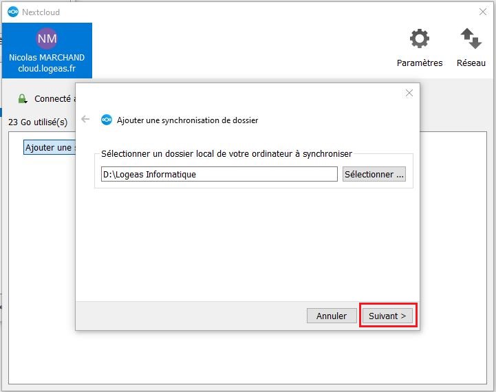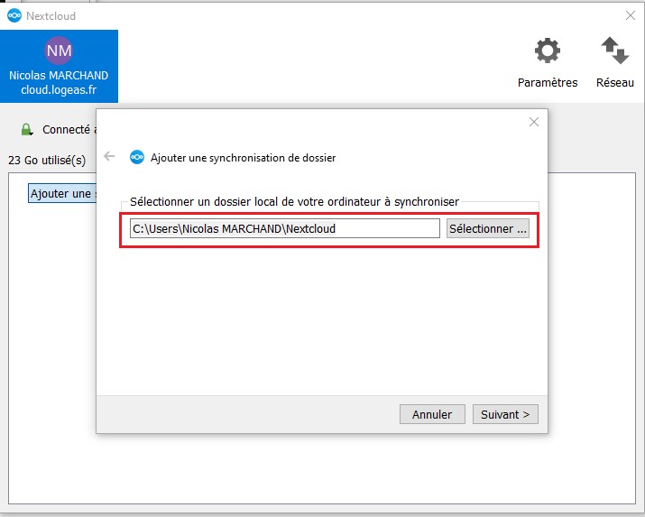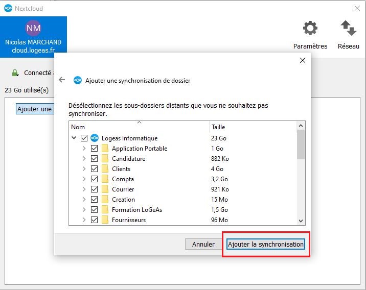ATTENTION : On ne peut pas synchroniser deux fois un même dossier, si vous avez déjà une connexion sur le dossier il faut la supprimer avant de créer la nouvelle