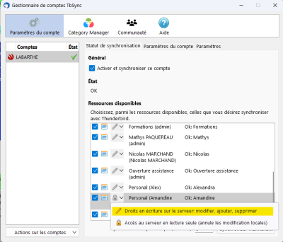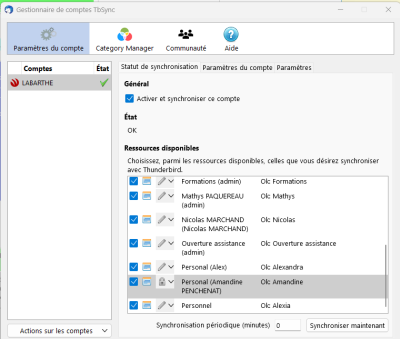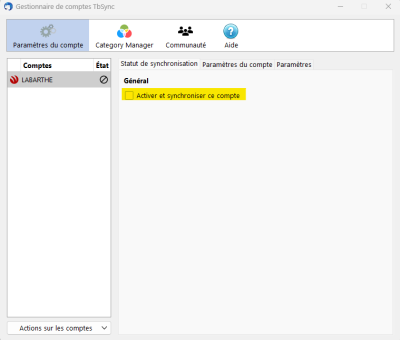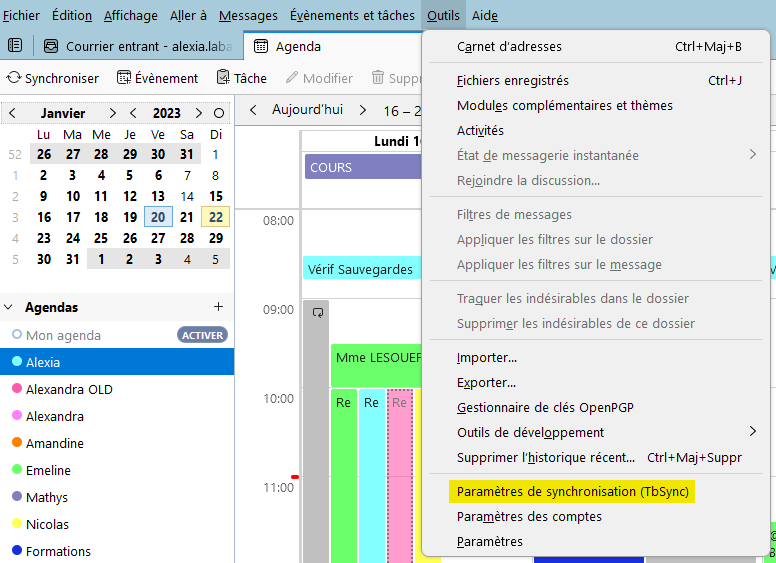 - Menu “Outils\Paramètres de synchronisation (tbsync)”