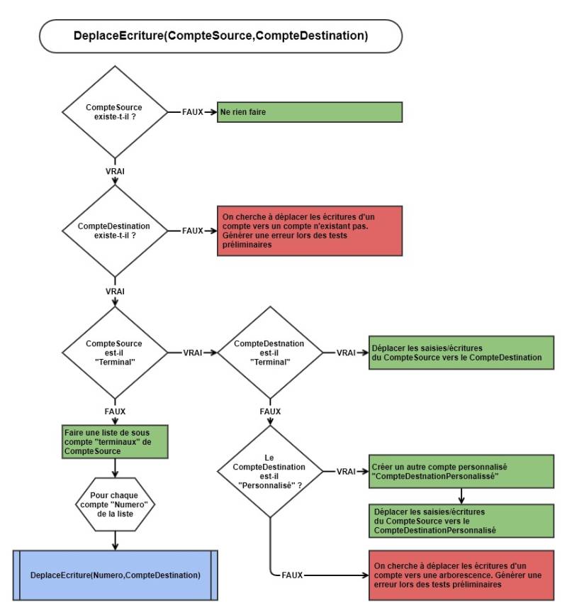 | 3 | Un compte source existant (terminal et non personnalisé) Un compte destination (terminal et personnalisé) Une série d'écriture sur le compte source | Un sous compte est ajouté au compte destination Les écritures du compte source y sont migrées |