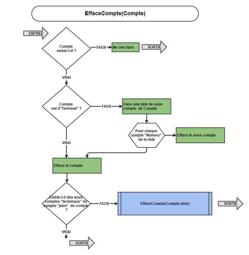 Efface purement et simplement un compte ainsi que tous ses sous-comptes (personnalisés ou non) ATTENTION La procédure efface aussi les comptes pères tant qu'il n'ont pas d'autre sous compte terminaux
