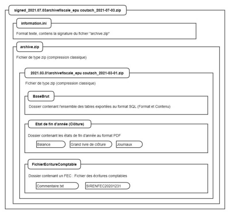 L'archive fiscale regroupe, dans un dossier compressé, et dans un format ouvert, l'ensemble des informations liées à votre comptabilité. Il peut être ainsi facilement présenté en cas de contrôle. L'archive fiscale n'a de valeur que générée sur une base clôturée. Nous avons fait le choix de regrouper les documents dans une archive ZIP (format ouvert et compris de la plupart des ordinateurs). Il comprend :