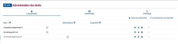 | 2 | Boutons d'actions lié à la gestion de droit. | Permet d'ajouter ou supprimer un utilisateur. Permet de valider ou annuler une modification. |