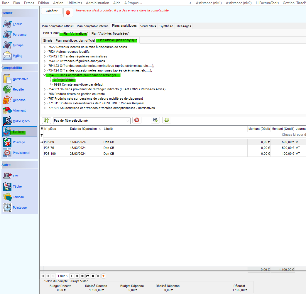 Cet analytique vous permet d’étudier les comptes selon les activités (animation) de votre association (chorale, stand de librairie, …). Pour ce faire, il vous suffit de créer les comptes correspondants dans le menu «Plan\Edition plan analytique "Animation"».