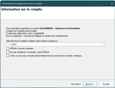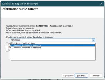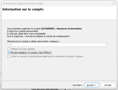 Le logiciel vous demandera sur quel compte vous souhaitez affecter les saisies liées à celui que vous êtes entrain de supprimer.