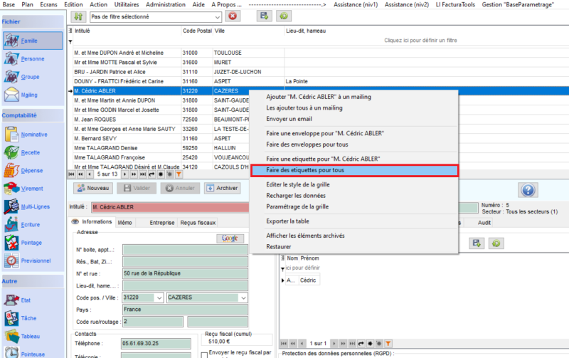 - Une fois la sélection faite, cliquer sur une ligne au hasard : elle devient bleue. Sur cette ligne bleue, faire un clic droit et sélectionner Faire des enveloppes pour tous ou Faire des étiquettes pour tous