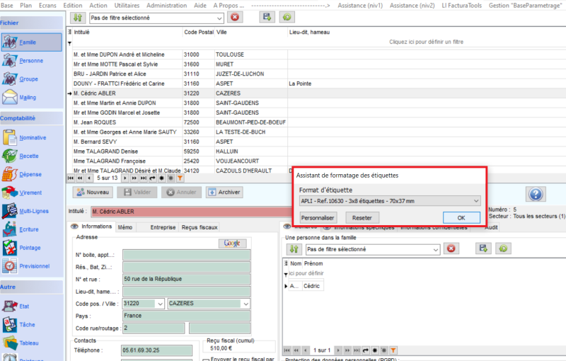 - Cliquer sur l'onglet Famille ou Personne suivant le besoin